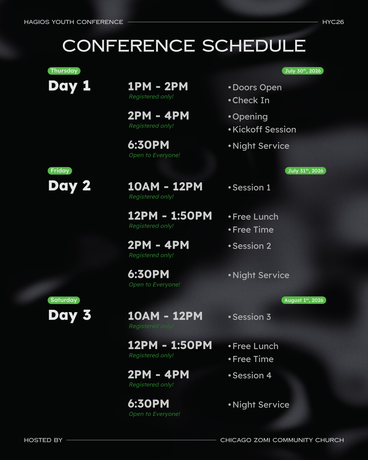 Tickets grant access to daytime conference sessions. Night services at 6:30PM are open to everyone.